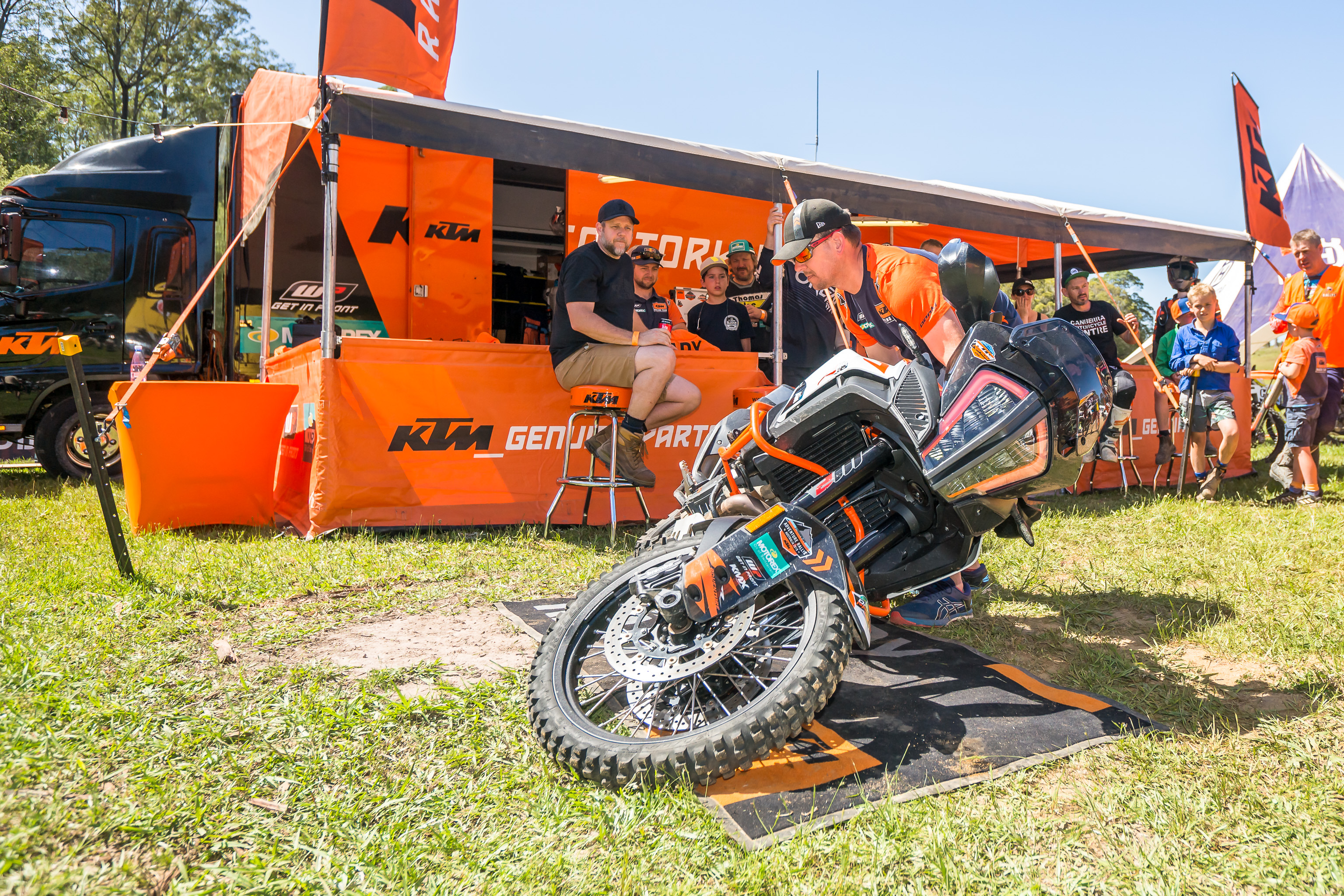 Saturday provided entertainment for the spectators on location at the Transmoto event, as riders in the KTM Ultimate Race Qualifiers had to complete a pass/fail bike-lift, wheel-change challenge and two timed special tests. The top five riders were then announced, based on accumulative scores, and they put on a final show with a ‘hot lap’ special test of the entire 26-minute Transmoto track.