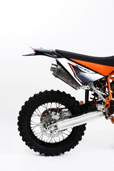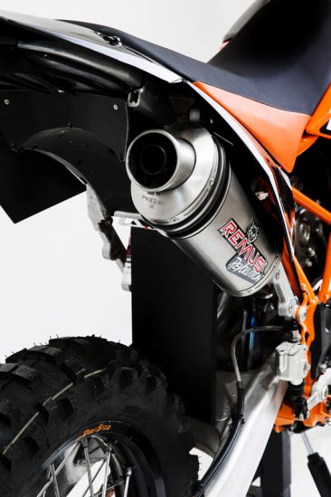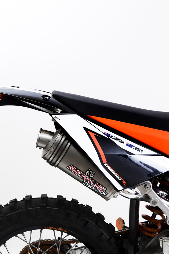 Chris and I had seen a few good versions of what we wanted to create on YouTube, one of which had a 2-into-1 exhaust done by CJ Designs in the states. These guys also modified and shortened our Remus silencer so that it tucked neatly under the side cover not unlike all EXC bikes. It also sounds great. The stock air filter and airbox were replaced with a rottweiler air filter and intake. Once this was done we had to change the jetting and tune the carburettor to suit the changes to intake and exhaust.