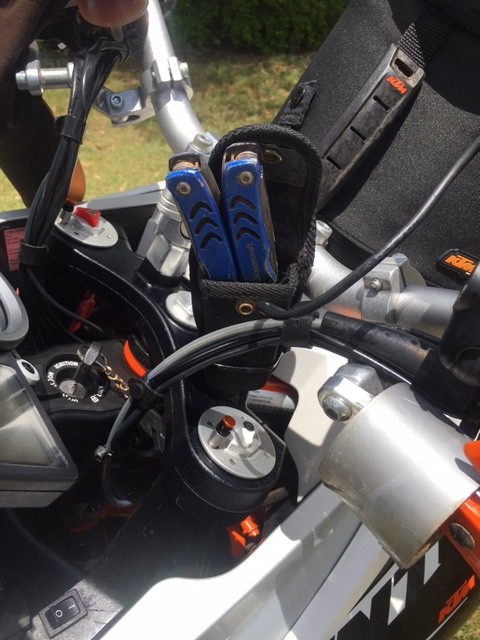 On the bars I fit the multi tool which has pliers, cutter, knife , screw drivers and all the other gear that they carry. On the Barkbusters, I put a roll of 100mph tape, always good for something.