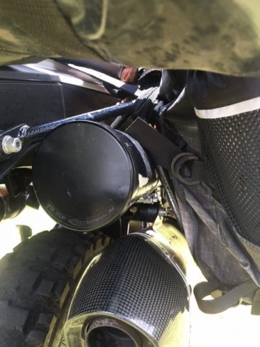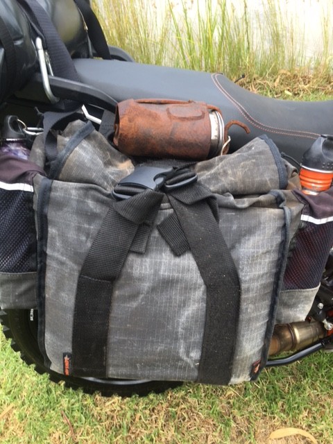 I strapped the quart pot to the top of the saddlebag racks and then run one of the saddlebag straps through the quart pot so that it doesn’t flap around. Yes you could put this in your saddlebag but why waste valuable room.