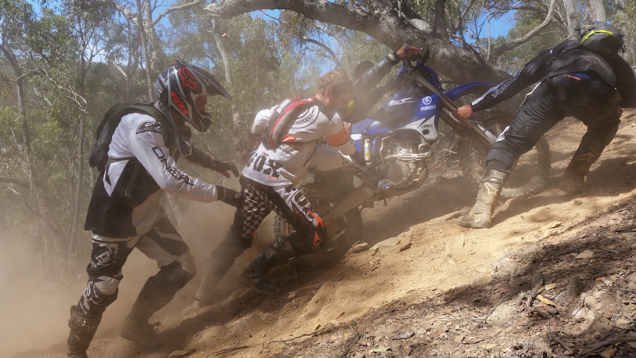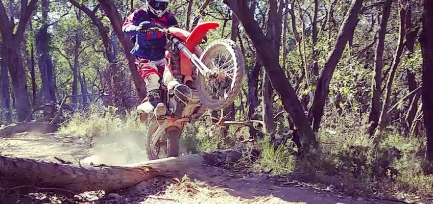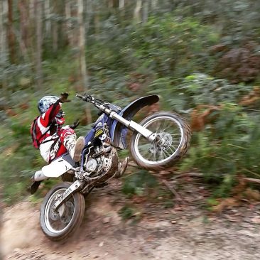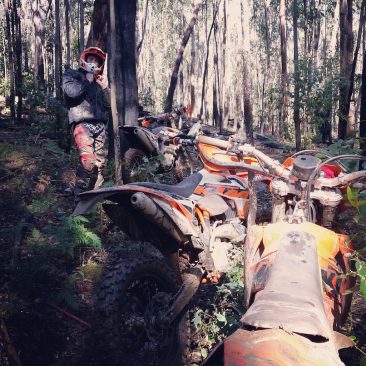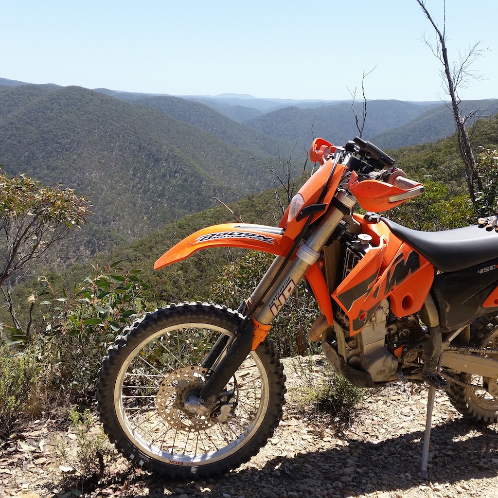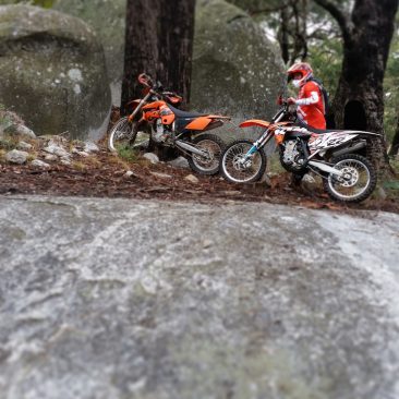 A little while back I took the Father-in-Law out of bike-riding retirement and dragged him out for one of our rides. He also has an earlier model 450 KTM that doesn’t miss a beat. My friends enjoy when he comes out riding as there will normally be some sort of story to tell by the end of the day. On this particular day I was taking him on some of my favourite single track which he is not the biggest fan of. There are some steep technical climbs out of the valleys and I was standing on the side of the track advising him which way to go and as he tried to make the section he lost control, turned hard left directly towards me on one wheel and the bike came flying at me at full speed. I was knocked to the ground and stuck under his bike while the back wheel tore through the seat of my pants and left tyre marks on my bare skin! I can’t be sure if he was aiming for me or not.