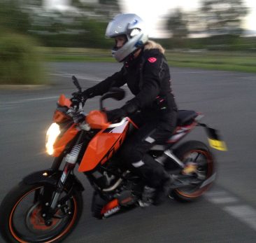 We had a neat little Duke 200 that had been used by our adult kids to get their licence and now it was time for it to go. Last chance for me, so I immediately went for and got my L’s. Then the “how to ride a bike” started. I wouldn’t say it went smoothly but I did at least have the advantages of good balance, a decent acquaintanceship with the clutch and a husband who has trained pilots with a reasonable amount of patience and a great deal of dedication.