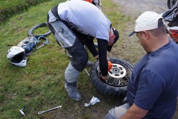 In the middle of Day 4, we found that one rider had flat tire, and we helped him to repair this. First, we tried to use green “Slime” for quick and easy repair, but it did not work, so we decided to change the tube. Side wall of Mitas is hard and it was quite time consuming to change the tube on the road side. While we were working, another rider stopped behind us, flat tire on the front. Tire changing party just started!
