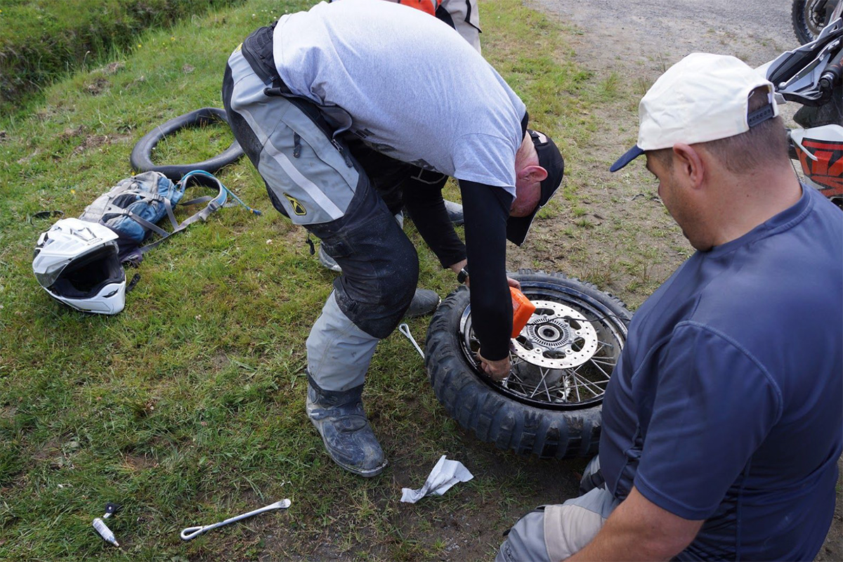I brought and carried all necessary items to fix flat tire, new tubes (both F and R), 3 tire spoons, handy bead breaker, rim protector, new bulbs, electric air compressor, even wet tissues to clean our hands. I could claim that I serve as Official rescue who carry such items (heavyweight tools made me difficult to ride off road though).