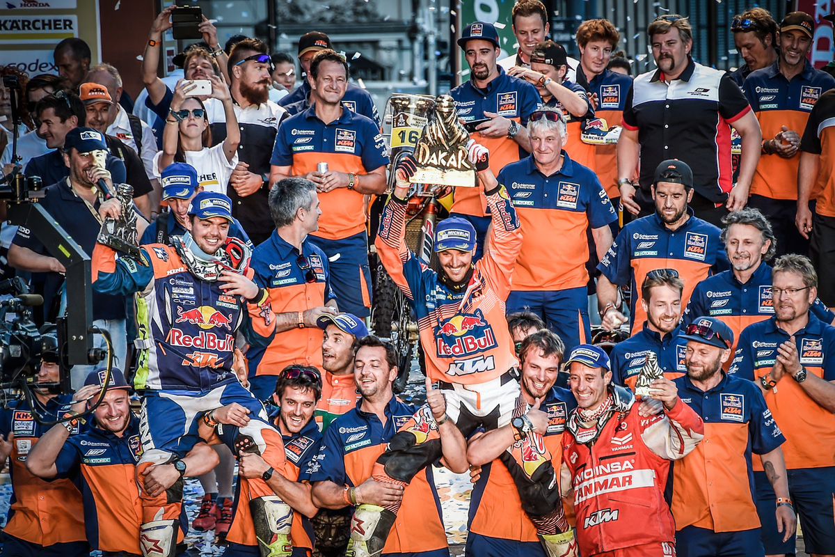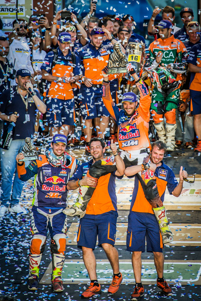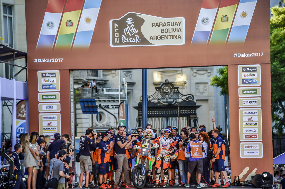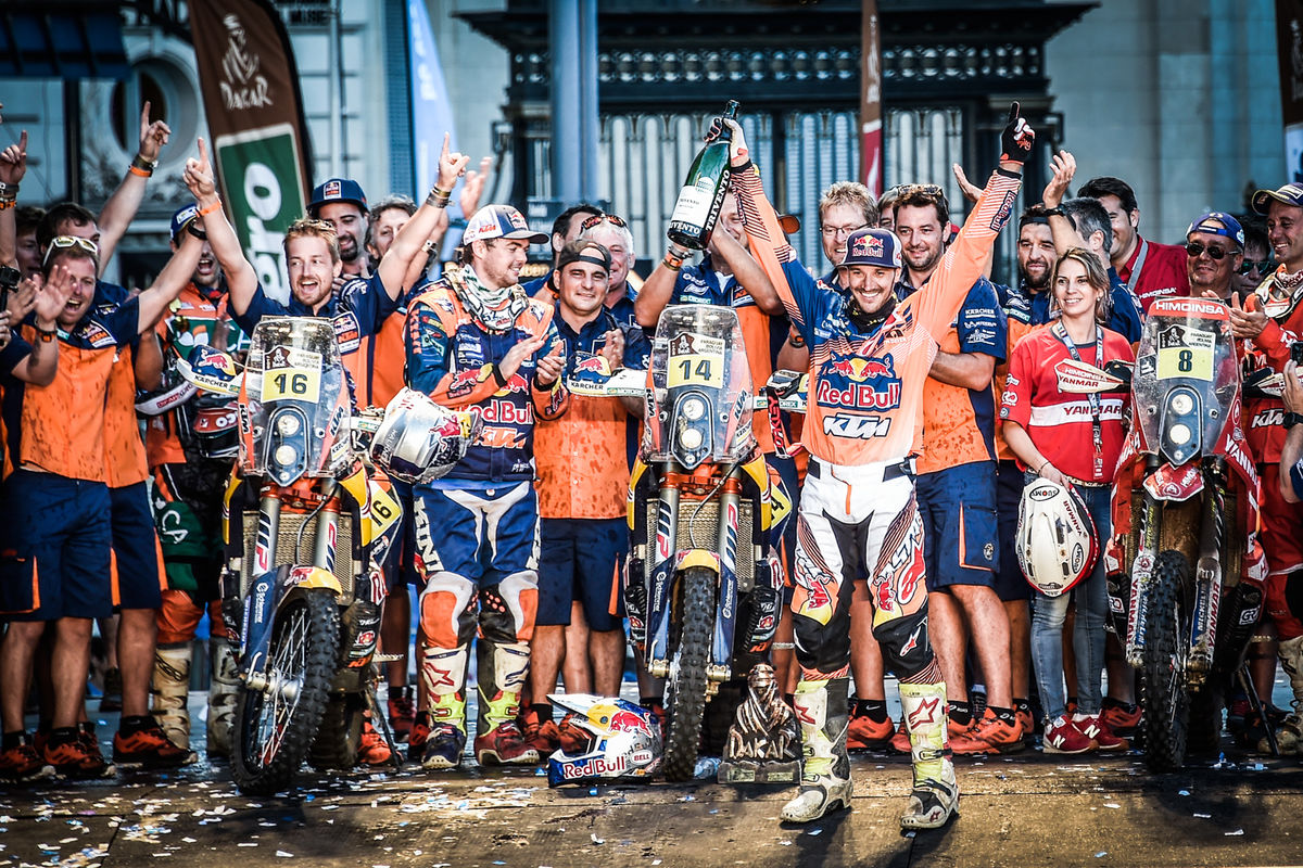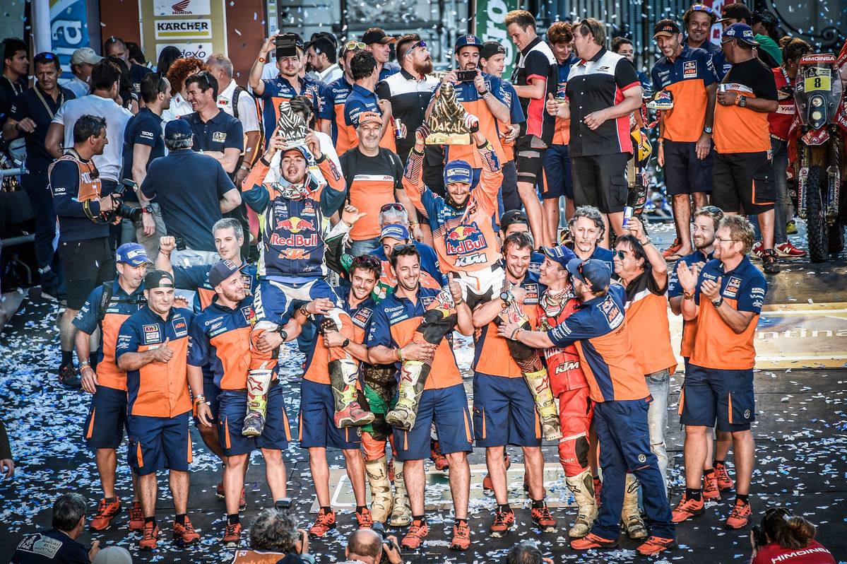 The 2017 Dakar Rally, an edition that delivered its share of drama was finally settled on Saturday when Red Bull KTM factory riders, Britain’s Sam Sunderland and Austrian teammate Matthias Walkner crossed the line 1-2 to give the Austrian brand its 16th consecutive victory. Spain’s Gerard Farres Guell completed a perfect day when he finished third for a complete KTM podium.